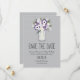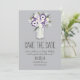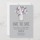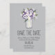 Elegant Mason Jar Save the Date Announcement. A Mason Jar filled with flowers in colours of Light and Dark Purples with White Daisies wildflowers. With a Silver Grey Coloured Background. If the colour scheme is not what you wanted please let me know and I'll recreate that for you but please contact me before placing an order. Email paula@labellarue.com Happy Wedding Planning! Make sure to pick your favourite cardstock to have it printed on.