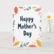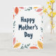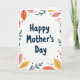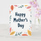 Designed with a bright white background, the card centers the words “Happy Mother’s Day” in large, rounded dark blue lettering. The message sits squarely in the middle, leaving generous space so the eye can rest before drifting to the border. Around it, a ring of stylized leaves and simple plant shapes wraps like a gentle hug, hinting at close family affection ❤️. The foliage mixes muted autumn orange, soft pink, mustard yellow, and calm teal-green, with light vein lines adding texture without feeling busy. Small decorative marks—tiny golden star shapes, little pink cross-like accents, and scattered dots—sparkle between the leaves like quiet moments of care. The layout feels friendly and calm, with the border evenly framing the text on all sides. Along the edges, the leaves alternate directions and sizes, creating a balanced wreath effect with a few 🌼-like flower forms tucked into the corners.