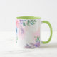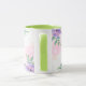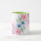 This lovely mug has images of pretty pink, lavender, blue and green flowers and accents all around the face of the mug over white background. Sample interior and handle is shown with striking lime green inside. Change to your choice handle/interior colour, if desired.