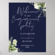 This elegant navy blue botanical greenery floral engagement party welcome sign can be personalised with your information in chic typography. Designed by Thisisnotme©