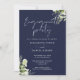 This elegant navy blue greenery floral engagement party invitation can be personalised with your information in chic typography with your monogram initials on the reverse. Designed by Thisisnotme©