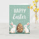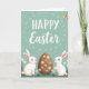 This card features a soft teal background with a festive message in white lettering placed near the top, framed by scattered white dots and small starburst shapes 🌷. Below, two fluffy white rabbits with long ears, pink inner ears, and rosy cheeks sit on either side of a large brown egg, leaning slightly inward as if sharing a quiet, friendly moment 🐰. Their eyes angle toward the center, creating a gentle sense of togetherness without needing extra decoration. The egg is decorated with bright yellow flower shapes that stand out warmly against the brown surface. Along the bottom edge, a strip of green grass spreads across the scene, dotted with small white-and-yellow daisy-like blooms. In the upper right, a small bird with yellow and orange feathers hovers as a lively accent against the calm background. Tiny white dots and starbursts continue to sparkle around the top text, while the rabbits and egg sit grounded in the meadow below.