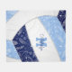 This boho volleyball themed fleece blanket for her features the realistic image of an abstractly oversized volleyball that has navy blue, light blue and white panels - a continuous doodle pattern of paisleys, flowers and feathers in white covers the volleyball's blue panels - personalise with the athlete's name and monogram, varsity letter or jersey number - by katz_d_zynes