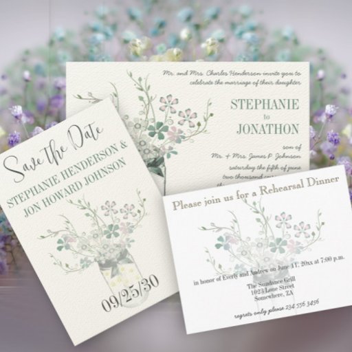 Sweetly illustrated Floral Pastel Dusty Blue and Blush Pinkish Lavender Mason Jar Wildflower Wedding. Folksy but elegant elements give this wedding collection an elegant outdoorsy feel. Trendy fireflies for added cuteness - so fun!