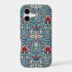 Intricate floral pattern with red, cream, and green leaves on a blue background. Symmetrical design evokes a classic, elegant, and ornate feel.