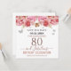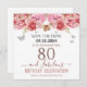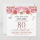 Girly glitter, millennial pink background, with fancy script name typography. Happy 80 and fabulous birthday design template. Pink Roses and butterfly top border. Great for 80th celebrations. Save the date celebration reminder.