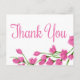 This pretty in pink floral postcard features hand painted flowers in complementing shades of pink and fuchsia with swirly green leaves highlighting a Thank you greeting printed in a fancy pink font with a crisp white background.
