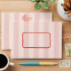 Red line art hand drawn dotted border over light pink stripe background. Back flap features floral illustration with return address.