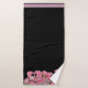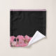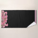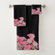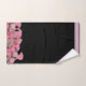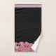 Ready and waiting to decorate your bathroom is this beautiful towel set with pink flowers set against the lower edges on a black background and pink border on the upper edges.