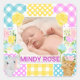 This sweet baby announcement design features a peaceful newborn photo framed by a soft pastel floral‑plaid collage. The patchwork border blends gingham, polka dots, and delicate pattern blocks in pink, blue, yellow, and purple, accented with charming illustrated flowers and adorable character motifs. The mix of textures creates a gentle, handcrafted feel with a warm, whimsical mood. Perfect for birth announcements, nursery décor, or keepsake gifts, this design pairs soft colour, playful details, and heartfelt charm.