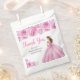 This sweet sixteen favor bag features a beautiful princess in a light pink ball gown with floral arrangements. This is perfect for a sweet sixteen birthday party.