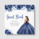This quinceanera guest book features a beautiful princess in a navy blue ball gown with floral arrangements. This is perfect for a quinceanera birthday party.