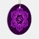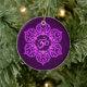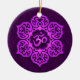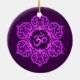 An Aum or Om design sits inside of a stylized lotus flower. The circular pattern is colored with a deep violet that is highlighted to create a light shine on the surface. The background is painted dark purple that can be seen through the negative space of the flower. A shadow appears just beneath the design making it seem to float just above the surface of the ornament. This stylish design is a striking representation of this spiritual symbol.