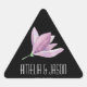 Personalised triangle stickers featuring a beautiful purple magnolia blossom watercolor and your text in chic white lettering on a black background, perfect for wedding party favours, bridal shower, wedding invitation seals and more. Available in different shapes. MATCHING ITEMS in our store.