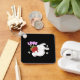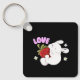 With a design featuring a cartoon-style white rabbit hugging a red heart with the word “LOVE” on it. Surrounding the rabbit are small white flowers. The background of the keychain is black, and it has a silver-coloured ring and chain attached to the top.