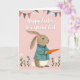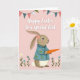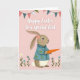 Designed with a blush pink background, this card features an upright bunny in side profile facing right, its long ears lifted with a soft pink daisy tucked near the tip 🐰. The bunny wears a teal jacket decorated with small pink flowers and green leaves, giving it a dressed-up look that feels like it’s ready to meet a dear friend. Held close in both paws is a large orange carrot, as if it’s being offered with a shy, affectionate gesture 🐇. A small white tail peeks out beneath the jacket, adding a gentle contrast against the teal and warm brown fur. Across the top, a curved string of triangular bunting flags mixes coral, teal, and white patterns, including polka dots and solid shapes. Along the lower edge, simple wildflowers in white and soft blue rise from thin green stems, framing the scene like a garden border. Centered over the bunny, the greeting appears in white flowing lettering, while the bunting arches above and the flowers sit neatly at the bottom.
