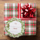 Beautiful floral Christmas gift tag with a wreath of sage green greenery, white flowers, and red berries where you can write to whom and from whom the Christmas gift is.