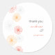 White, round wedding thank you sticker with coral and yellow flowers and light grey reflections.