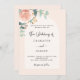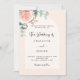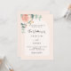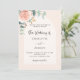 A blush rose gold background with an arch. Decorated with a rose gold and pink floral, rose flower and green watercolored eucalyptus greenery. Personalise and add your names and details.