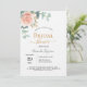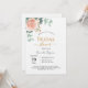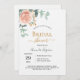 A chic white background. Decorated with a rose gold and blush pink floral, rose flower and watercolored eucalyptus leaves, sprigs, greenery and a faux gold sprig. Personalise and add the name of the bride to be and party details. Black and golden coloured letters.