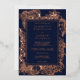 A modern hand drawn elegant floral real rose gold foil illustration with frame wedding invitation on navy blue. Perfect for elegant, chic wedding.