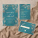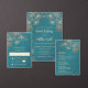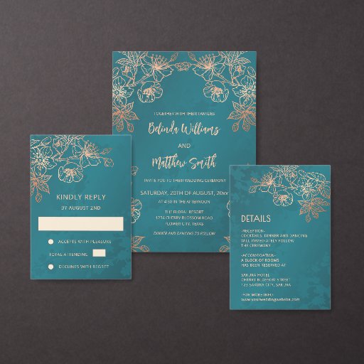 Rose gold floral line art cherry blossoms on a teal background. Matching wedding invitation available.