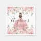 Add a whimsical and elegant touch to your Quinceañera celebration with these beautiful party napkins! Featuring a charming blush pink floral theme, the napkins showcase delicate watercolor roses in soft pink hues, paired with lush green leaves. At the centre, a brunette girl in a faux glitter pink ball gown and tiara adds a regal and magical touch, making these napkins perfect for celebrating your special day. A sparkling pink tiara sits above the text for an extra hint of sophistication.