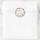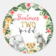 Cute safari themed birthday sticker featuring four watercolor jungle animals, some hibiscus and frangipani flowers as well as dark green tropical foliage.