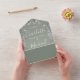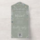 All in one wedding invitation with pretty greenery floral, signature style names and chic typography on a sage green background. The invitation includes a perforated RSVP card that features your wedding website QR code. Designed by Thisisnotme©