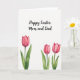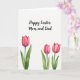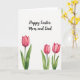 This greeting card features a tall, white background that leaves plenty of open space for the artwork to breathe. Near the top, a flowing seasonal greeting is placed in black lettering, centered and easy to spot at first glance. The generous spacing around the words gives the message a calm, intimate feel, like a quiet note between close friends. In the lower half, three painted flowers rise on long green stems with broad leaves, their soft pink petals suggesting a gentle, affectionate closeness. One blossom stands alone on the left, while two blooms lean toward each other on the right, as if sharing a private moment 🌷. The watercolor look shows light brush marks and see-through layers that add softness without looking fussy. The pinks shift from pale blush to deeper rose, with small highlights that make the petals look slightly curled and open. The two right-side flowers sit close together above overlapping green leaves, with the left flower spaced apart against the white field 🐇.