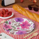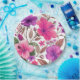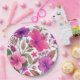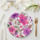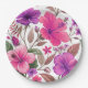 The picture shows a lively mosaic of lush hibiscus flowers in strong pink, delicate lilac and deep purple, harmoniously spread over a white background. The flowers are joined by filigree leaves and delicate green stems, which exude natural elegance. It conveys a sense of joy, warmth and exotic beauty, as if you were immersing yourself in a tropical garden full of colors and life.