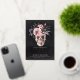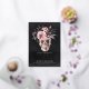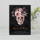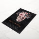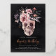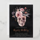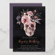 A spooky chic Halloween birthday party invitation featuring a floral skull illustration topped with pink and purple watercolor flowers on a smoky black background. Personalise this unique and elegant Halloween birthday party invitation with your event details in white and smoky blush lettering with rose gold foil accents.