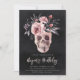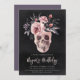A spooky chic Halloween birthday party invitation featuring a floral skull illustration topped with pink and purple watercolor flowers on a smoky black background. Personalise this unique and elegant Halloween birthday party invitation with your event details in white and smoky blush lettering.