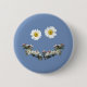 Smiling face assembled from blossoms (daisies and apple) on a background of blue sky.