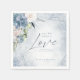 A handwritten, signature font combined with geometric frames, sparkly backgrounds and lush florals are used in this collection to set a warm and intimate tone for your wedding. The wedding paper napkin shown here, with it's corner floral arrangement in trendy dusty blue and cream provides the optional text of 'ALL WE NEED is Love, Everyone else feel free to enjoy dinner!". Search ID889 to see all the products in this wedding set.