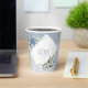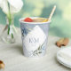 A handwritten, signature font combined with geometric frames, sparkly backgrounds and lush florals are used in this collection to set a warm and intimate tone for your wedding. The wedding paper cup shown here, with it's corner florals in shades of dusty blue, provides a template to easily add your own initials and wedding date. Search ID889 to see all the products in this wedding set.