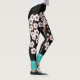 Floral Spring Garden with Singing Birds on these leggings feature pink blossoms and white birds with scalloped aqua border on black background.