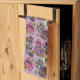 This Día de los Muertos kitchen towel features a hand-drawn floral sugar skull pattern showcasing intricate black pen illustrations of calaveras adorned with flowers and roses.