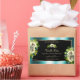 Matching a shimmering teal frame with a fine gold decor on a black background.
