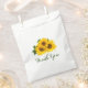 This charming floral bag features vibrant yellow sunflowers nestled in lush green leaves with a thank you greeting printed in a calligraphy style green font.
