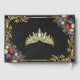 The Guest Book features an elegant black background embellished with a tiara, a frame of gold leaves, and a lovely floral bouquet. Designed as coordinate with the "Floral & Gold Leaves - Black & Pearl" Quinceanera collection. To change details, click «Personalize». To move the text or change the text size, font, or color click «Click to customize further»