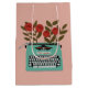 Vintage teal typewriter with flowers growing out of it, on a pink background. The sides of the bag have a smattering of symbols on a pink background.