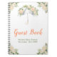 Beautiful baby shower guest book with a white umbrella and peach and cream floral arrangements. Perfect for a baby shower. The words can be changed to suit your own details or requirements