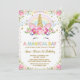Unicorn Birthday Invitation featuring a cute illustration of a unicorn face, watercolor flowers and sprinkles of pink & gold confetti stars