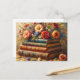 This postcard features oil painting artwork of a stack of ornate vintage books adorned with vibrant wildflowers, creating a perfect blend of literary charm and nature’s beauty. The antique books are decorated with embossed gold detailing, intricate patterns, and warm, earthy tones. A lush bouquet of colourful flowers, including daisies, cosmos, and cornflowers, gracefully spills over the books, symbolising knowledge, creativity, and the passage of time. This romantic aesthetic artwork is ideal for themes related to literature, vintage decor, floral elegance, and book-inspired art, making it perfect for book lovers.