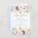 Sweet spring flower bouquet with pink roses, blue hydrangeas, purple and yellow flowers on a watercolor blue background. Elegant modern script typography with delicate swirls elements. Soft pastel shades of yellow, blue and pink are the main colours of this wedding suite. Personalise the text, add wedding information and make this invitation yours.