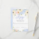 Sweet spring flower bouquet with pink roses, blue hydrangeas, purple and yellow flowers on a watercolor blue background. Elegant modern script typography with delicate swirls elements. Soft pastel shades of yellow, blue and pink are the main colours of this wedding suite.