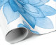 Rolled and flat views of floral wallpaper with blue blossoms and leaves on a white background, conveying a serene and elegant tone.
