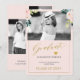 Elegant watercolor floral graduation announcement card featuring pastel peony roses bouquets with navy foliage and leaves, and a faux gold and dark blue chic calligraphy script over a pink blush (changeable color) background.+++++++++ Easy to personalize on both sides with your 3 photos, graduate's name, school, class, and your text.