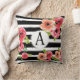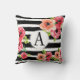 Floral Watercolor Monogramed Black White Stripes Cushion